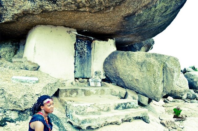 – The cave dwellings at Obaluaye Garden. The caves are now used as shrines.