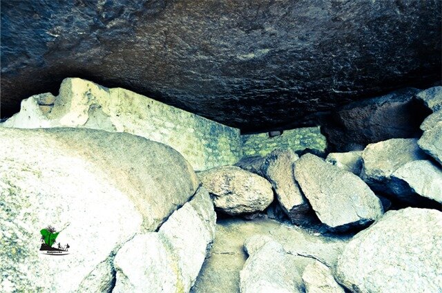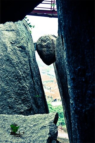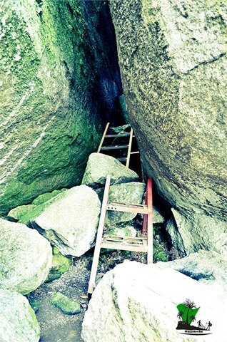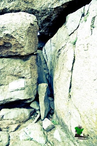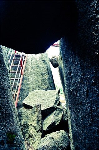 … path which leads to the upper sections of the rocks was tight and narrow, enclosed by steep and slippery rock-faces and its floor riddled with large boulders. A flight of metal stairs leads through the passages and up the rocks.