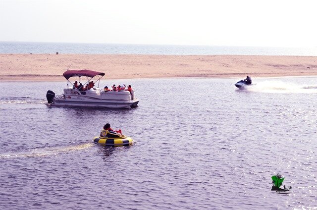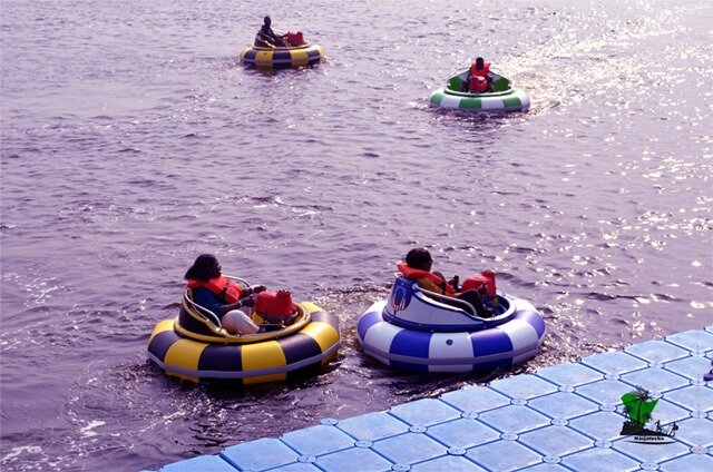The sitting area consists of a set of open sheds with rows of neatly arranged tables and benches. There were only a few tourists at the resort at the time. I was glad that my calculation was right. However, everyone looked happy. A woman and her three children wore and buckled life jackets at the top of the lake jetty, while a couple who sat under one of the sheds laughed at their children who had brought toy trucks to play with sands at the beach. Gradually, more tourists swept into the resort as the noon sun soared up in the skies. At the far end of the sitting area, the quad bike race track twisted, turned and bounced through heaps of sand, with boundaries marked with old vehicle tires half-buried in the ground. The lake itself has a sizable jetty which consist of a set of floating plastic boxes strung together in regular structure. Moored at the jetty are jet skis, pontoon boats, bumper boats and pedal boats. Two marine instructors assisted a group of friends into one of the pontoon boats as wind-swept waves