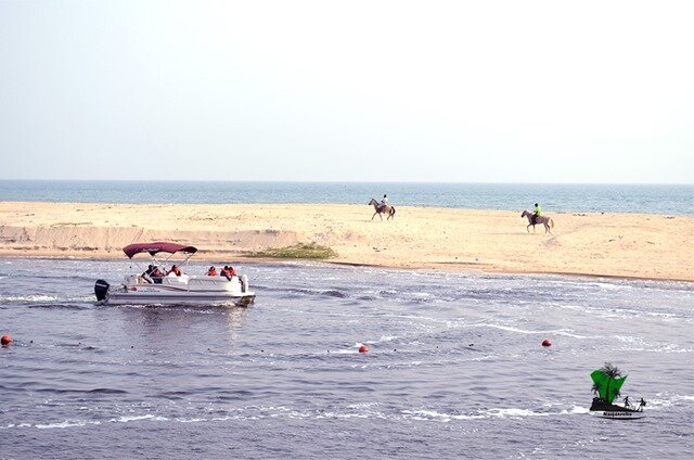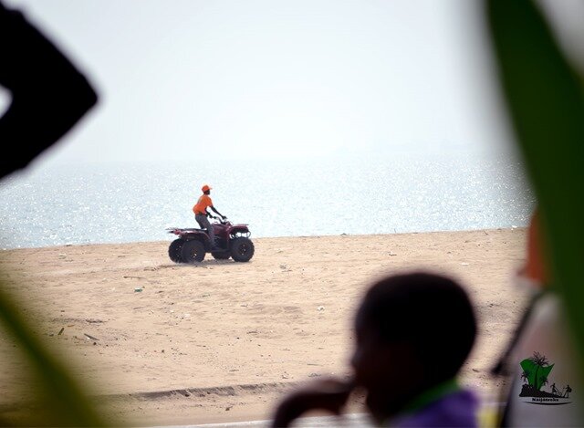 The big barbecue stand held and turned a full goat, roasting it above a pile of flaming hot coal. My mouth watered, my tummy ached and I longed for a bite of the roasting meat. I quickened my pace and walked past the barbecue stand and a breath-taking view met me. The raging blue sea sprawled far ahead, but has been kept away by a beautiful lake which stretched to my left and right and has dissected the beach into two separate parts. Two horses sauntered gracefully on the far narrow sandy stretch that separated the lake from the ocean, as a quad bike blew a cloud of dust at the horses and their riders as it swept-by on high speed. The bike rider laughed and waved at the horse riders as the cloud settled. He drove to the far end of the lake and turned towards the reception area of the resort where I was. He is apparently one of the resort staffs on patrol. His job is to ensure that the bounds of the resort is free from ‘area boys’.