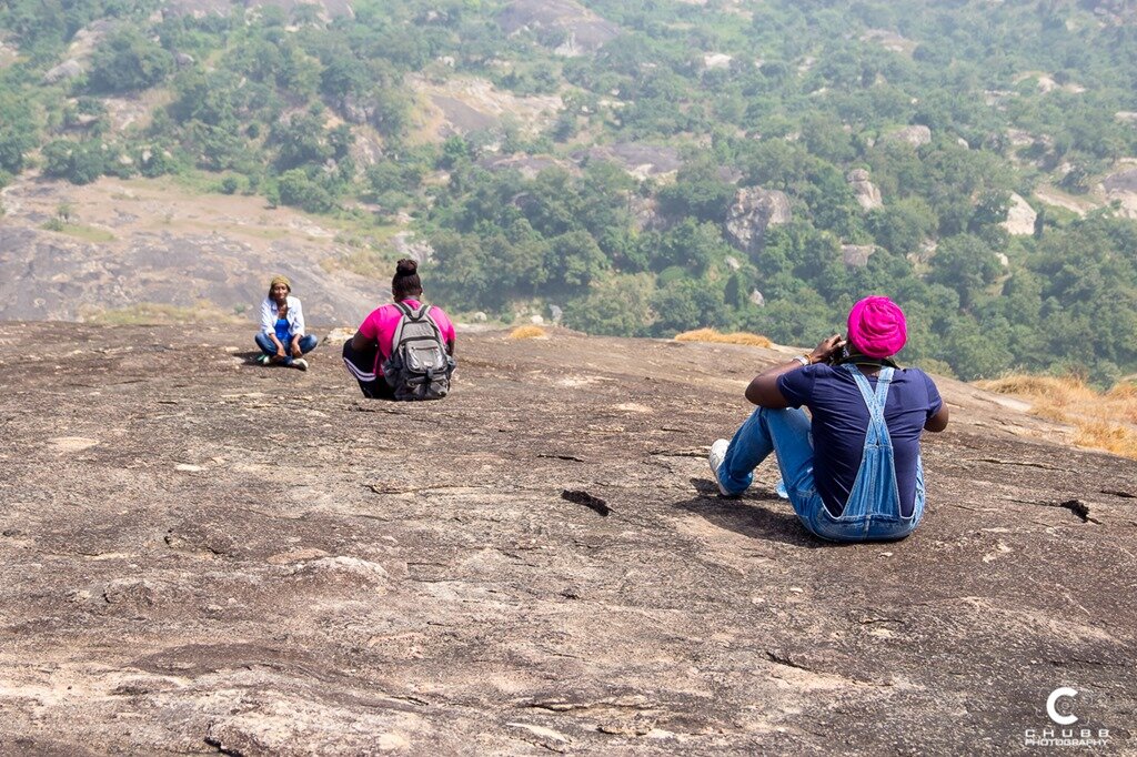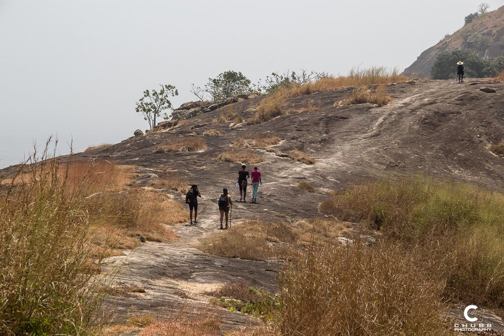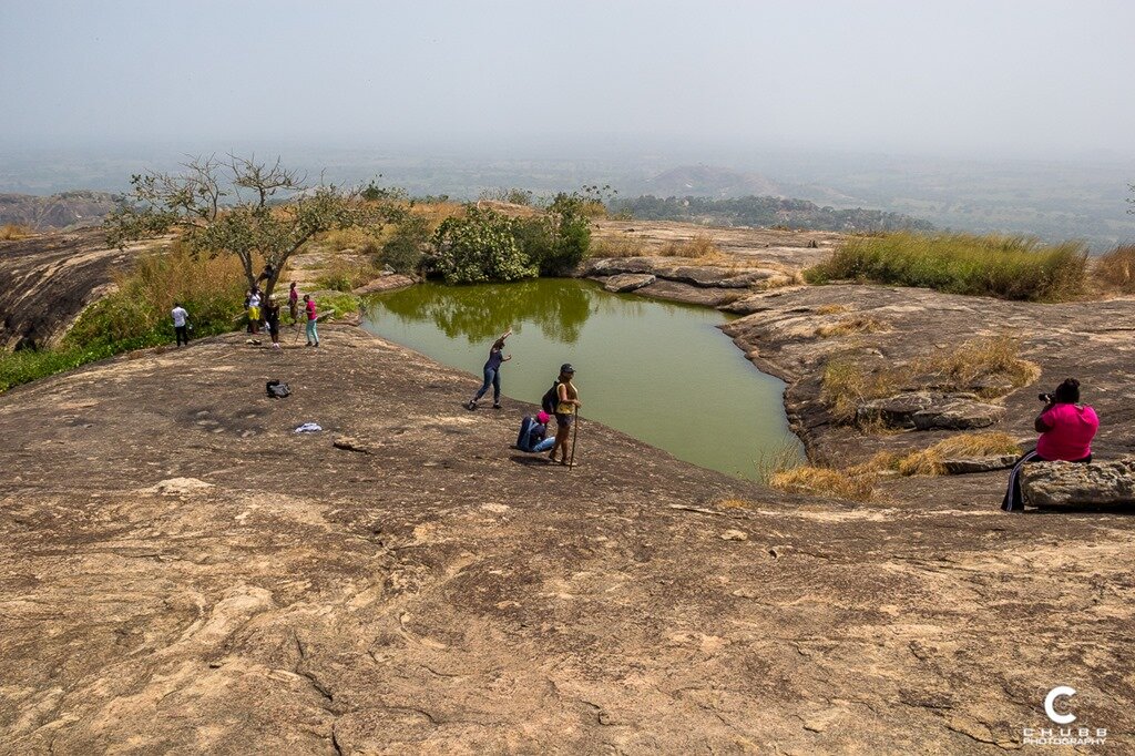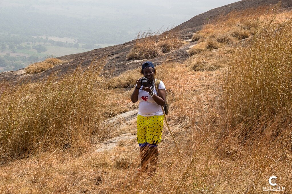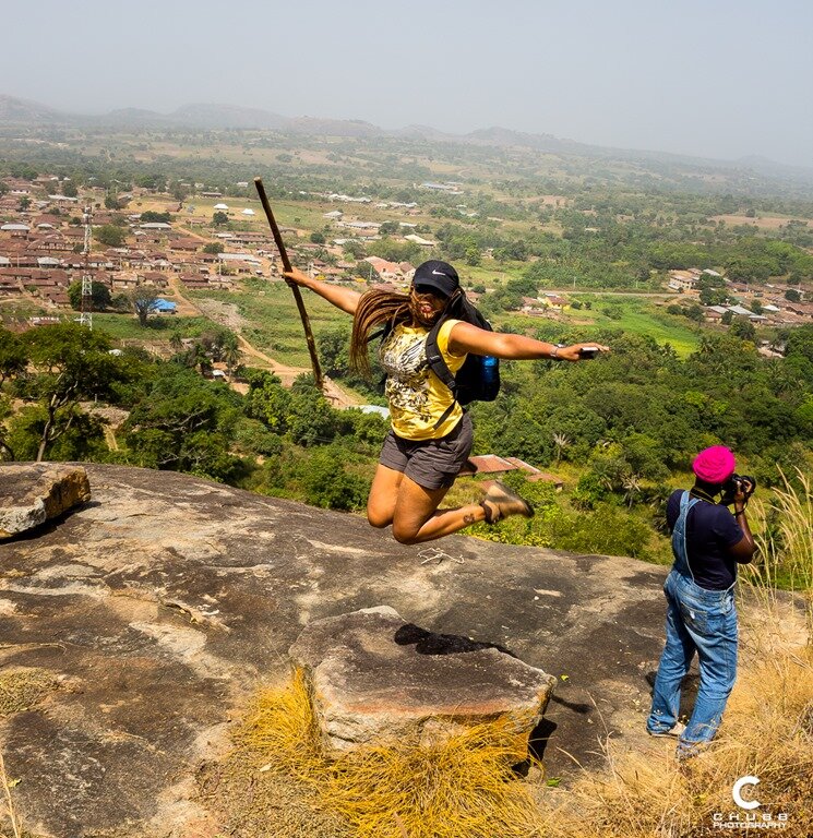 Hours later, we finally got to the sleepy town of Ado Awaye in Oyo State. A wrong turn gave us a moment to take a beautiful shot of an old leafless tree. Such was the pull of its sheer magnitude. Enthusiastically, we continued our journey to the foot of the mountain where we met Mr. Adediran Adesegun, the old custodian of the mountain trail. Being an older man, he got Victoria, a young lady from the town to be our guide. Sticks were brought out and medical conditions were verified and we eager beavers were on our way. Soon groans could be heard as we climbed uphill maneuvering our way over the broken uneven steps. Intermittently, stops were made to catch breaths until; finally we made it to the first point. The Ishaga Rock formation was picturesque as always with the white material from a previous ritual at its base. We took moments to catch our breath, and after recovering went about taking pictures. The view from above was awesome and inspiring. There was excitement to see such beauty at the end of an intense climb. Everyone acquiesced that they underestimated the intensity of the climb as expressed in the dossier.
