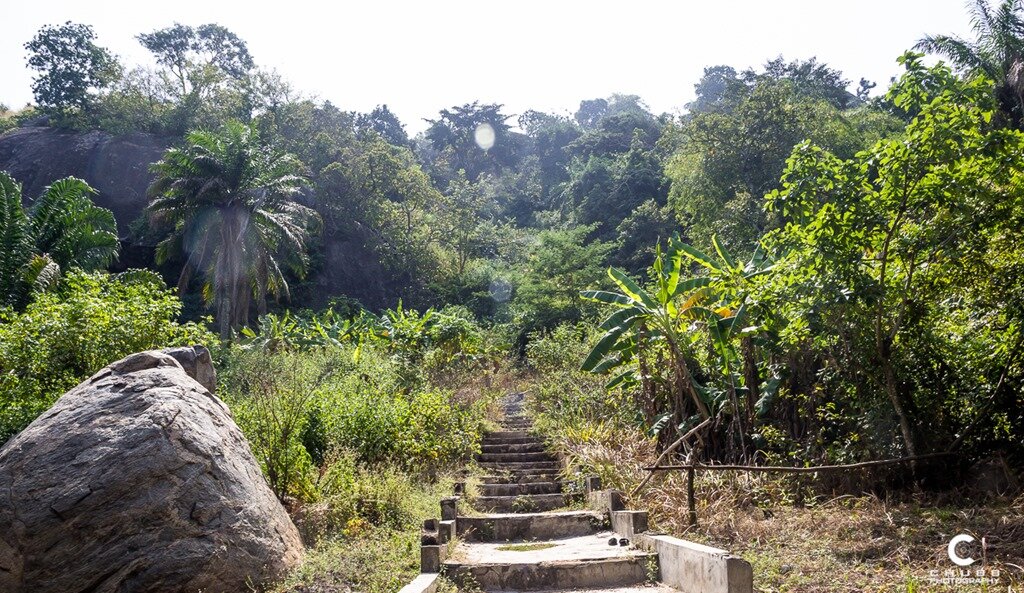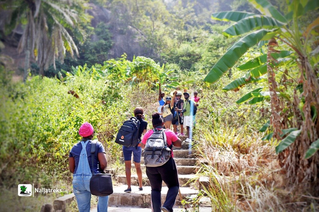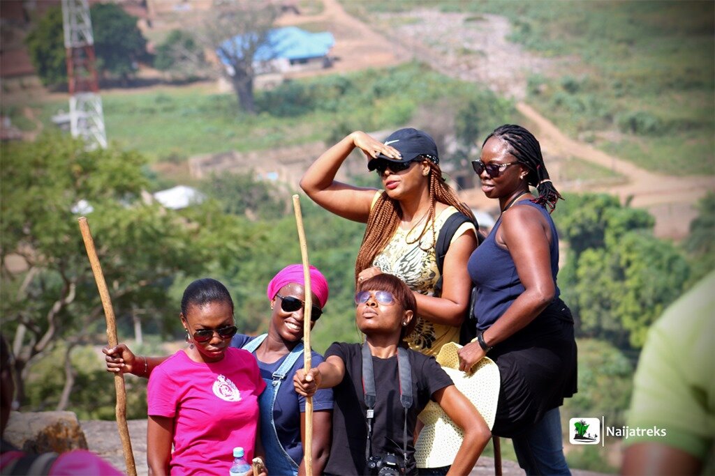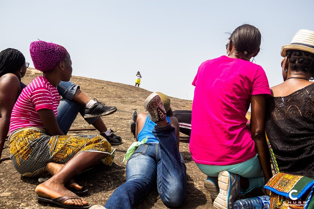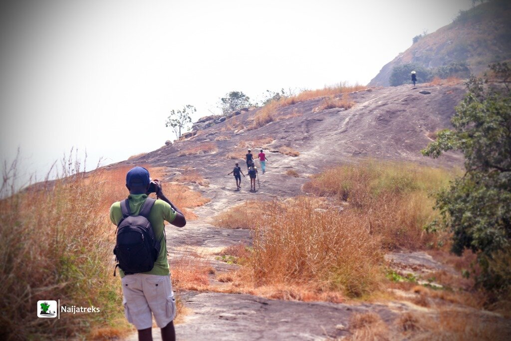 Hours later, we finally got to the sleepy town of Ado Awaye in Oyo State. A wrong turn gave us a moment to take a beautiful shot of an old leafless tree. Such was the pull of its sheer magnitude. Enthusiastically, we continued our journey to the foot of the mountain where we met Mr. Adediran Adesegun, the old custodian of the mountain trail. Being an older man, he got Victoria, a young lady from the town to be our guide. Sticks were brought out and medical conditions were verified and we eager beavers were on our way. Soon groans could be heard as we climbed uphill maneuvering our way over the broken uneven steps. Intermittently, stops were made to catch breaths until; finally we made it to the first point. The Ishaga Rock formation was picturesque as always with the white material from a previous ritual at its base. We took moments to catch our breath, and after recovering went about taking pictures. The view from above was awesome and inspiring. There was excitement to see such beauty at the end of an intense climb. Everyone acquiesced that they underestimated the intensity of the climb as expressed in the dossier.